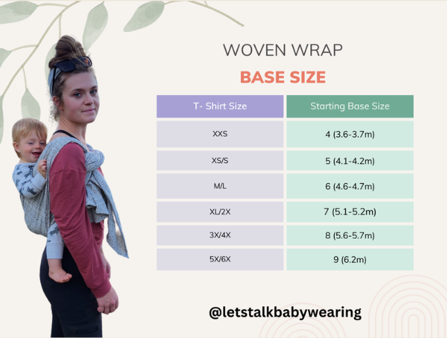 Most beginners start with a base size. Your base size is the length that allows you to comfortably tie a Front Wrap Cross Carry (FWCC). Smaller or larger sizes may be better depending on your height, body type, and the carries you’d like to learn. See sizing guide below.